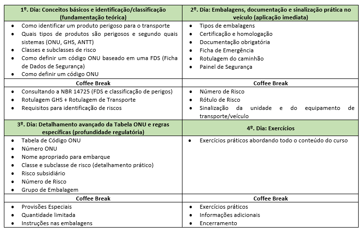 Capacitar profissionais a identificar, classificar e gerenciar corretamente produtos perigosos no transporte rodoviário, conforme normas nacionais (ANTT) e internacionais (ONU/GHS), garantindo conformidade regulatória e segurança operacional.